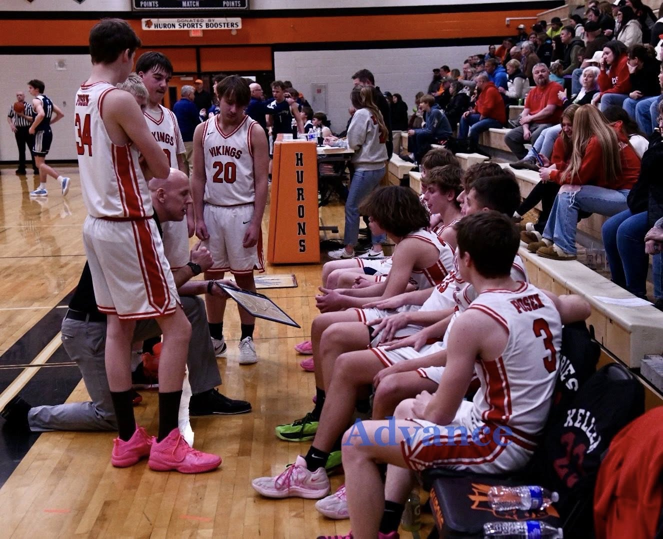 Posen coach Chris Keller talks strategy with his team in Wednesday’s game with Gaylord St. Mary.